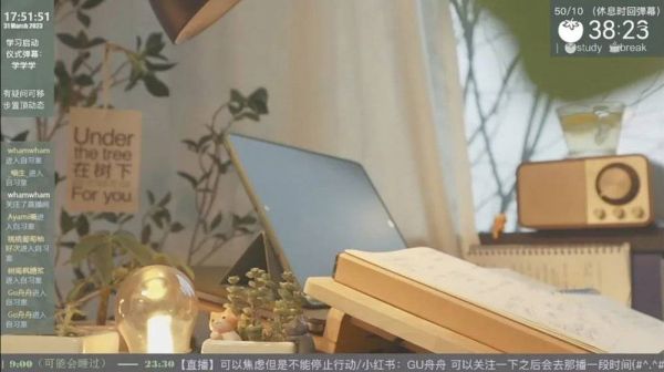相较于其他形式的网络直播,学习主播在直播时不需要与观众互动,一张桌子、一部手机、一本书就能开始直播,可以说是最没有门槛的直播形式之一。但随着观看受众越来越多,学习主播在直播间搭建上也动了不少巧思。B 站学习主播 Gu 舟舟(以下简称舟舟)表示,刚开始做学播的时候,在一个很小的出租屋内,直播设备、画面布置等等,几乎是有什么就用什么。到后期逐渐自己摸索试错,学习模仿国外陪学视频画面,购买相对专业的相机、补光灯等等,一点点把考研学习直播间搭建起来,也吸引到了 2 万粉丝。
