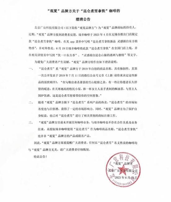 同一个“昆仑煮雪”?观夏发布澄清公告,未和瑞幸咖啡联名
