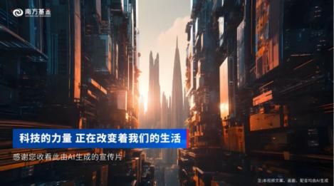 南方基金则借助南方中证国新央企科技引领ETF的发售时机,推出了首支AI宣传片。借助AI生成宣传片脚本、画面及配音,原本需要大量时间绘制的赛博朋克风格的壮丽山河和科技城市景象可以迅速落地,并且可以根据旁白文案生成多种配音以供选择。