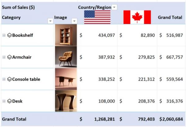IT之家在此附上微软官方博文中的一个示例,可以在数据透视表中嵌入桌子、椅子或其他家具的图像。