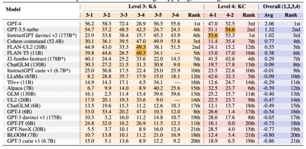 可以看到,开源模型的能力一般相较GPT-4等模型而言要明显差一些,这在知识应用与创造层级上也能观察到。然而,GPT-4即使在这两个层级上的表现都取得了第一,小分也并未霸榜。在标黄的分数上,GPT-4依然技不如人。甚至,在下图中,GPT-4在知识创造层级上的平均表现仅排第三,落后于GPT-3.5与InstructGPT。