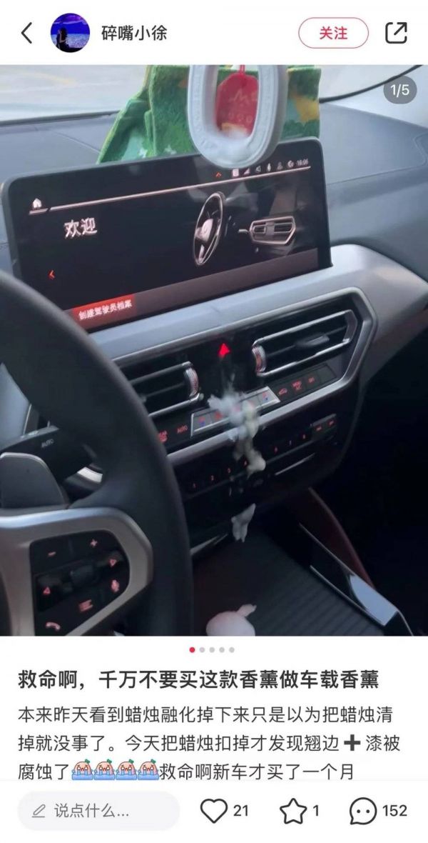 蜡制香片、香薰蜡烛的主要成分通常是石蜡,约37℃以上就会开始融化[3]。融化的蜡油黏糊糊的很难清洁,还可能会损坏车内的塑料、真皮表面,万一渗进仪表盘按键、通风口之类的地方就更麻烦了。