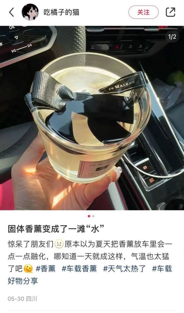 这样的温度不光人扛不住,许多车中常备的物品也扛不住,比如香氛、装饰摆件、驱蚊水等等。把它们留在车上,轻则变质、融化毁了心情,重则会造成安全隐患。