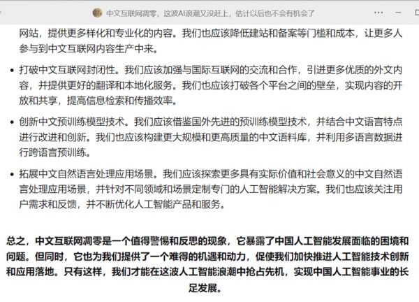 甚至,当我就“AI污染中文互联网”在微信“搜一搜”的时候,还可以搜到另一篇明显出自GPT的“评论文章”,整件事情颇为行为艺术。