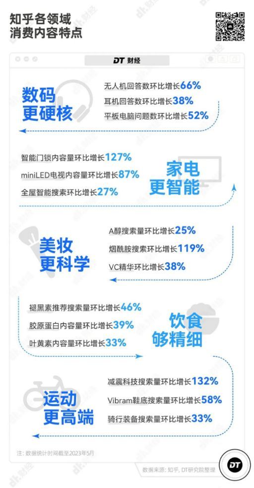 报告显示,今年618前夕,知乎上无人机回答数环比增长66%,平板电脑问题数环比增长52%,耳机回答数环比增长38%。截至5月底,智能门锁内容量环比增长127%,miniLED电视内容量环比增长87%,全屋智能搜索环比增长27%。