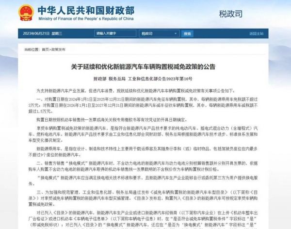 6月21日,财政部、税务总局、工业和信息化部等三部门发布《关于延续和优化新能源汽车车辆购置税减免政策的公告》(以下简称《公告》),宣布对购置日期在2024年1月1日至2025年12月31日期间的新能源汽车免征车辆购置税,其中每辆新能源乘用车免税额不超过3万元;对购置日期在2026年1月1日至2027年12月31日期间的新能源汽车减半征收车辆购置税,其中每辆新能源乘用车减税额不超过1.5万元。