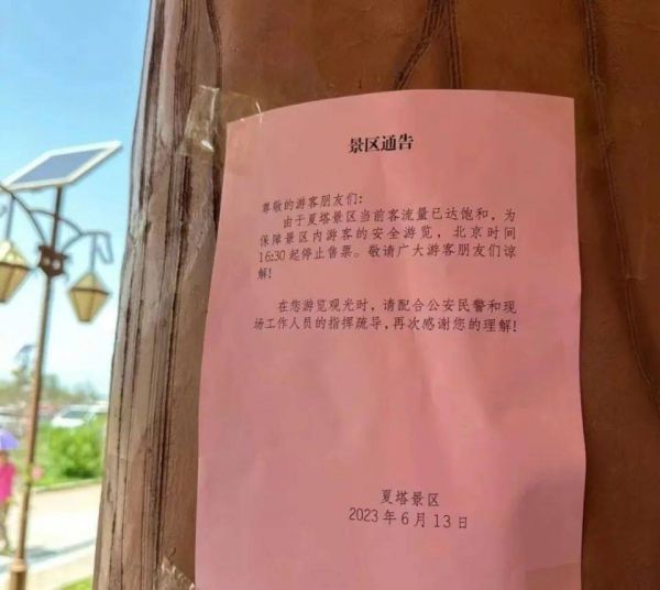 客流暴增对景区接待运营造成了不小压力。6月13日当天,夏塔景区发布通告称,由于景区当前客流量已达饱和,北京时间16:30起停止售票;6月14日起,夏塔景区每日限购门票3800张,并随后开放了线上预约通道,可提前预约七天内门票。不过,据张欣称,三天内的门票较为难抢。