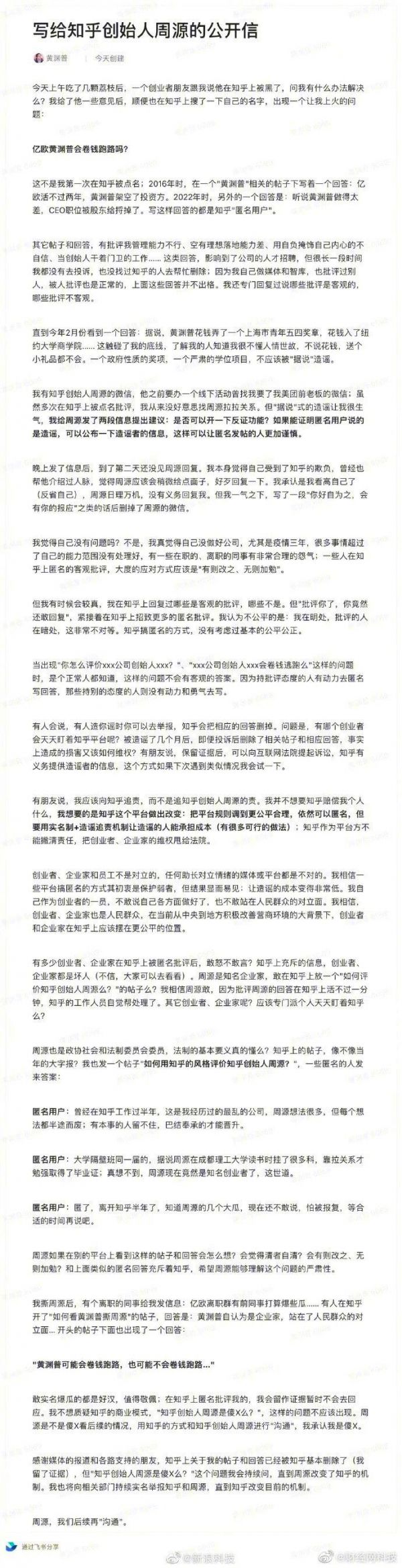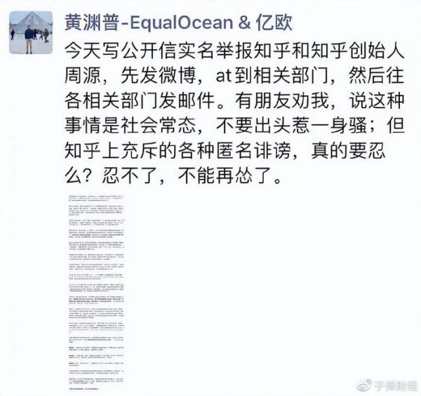 【#亿欧创始人黄渊普实名举报知乎#:开通反证功能 公布造谣者信息】据@财经网科技 报道:6月21日,亿欧网创始人黄渊普发布公开信,实名举报知乎及知乎创始人周源。公开信中提到,针对知乎上对其本人的匿名回答,黄渊普曾给周源发信息提出建议:“是否可以开一下反证功能?如果能证明匿名用户说的是造谣,可以公布一下造谣者的信息,这样可以让匿名发帖的人更加谨慎。”