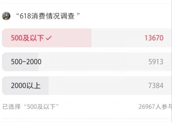 近日,在以一二线城市女生用户居多的小红书上,有用户发起的“618消费情况调查”显示,在近2.7万人的投票中,有近1.3万人花费金额在500元以下,5800人花费在500-2000元,消费在2000元以上的有7300人。