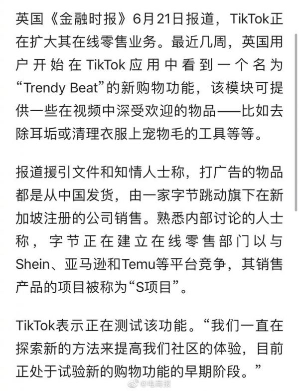 #TikTok制定S计划试水网购# TikTok推出“Project S”计划,进军网购市场,准备挑战Temu、Shein和亚马逊!