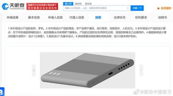6月20日消息,天眼查App显示,北京小米移动软件有限公司申请的“手机”专利获授权。摘要显示,该产品用于通讯、运行程序、信息显示、人机交互,设计要点在于环形曲面屏幕,前后摄像头均采用屏下摄像头,产品的正面和左右两侧无边框,背面的屏幕无凸出装饰件。