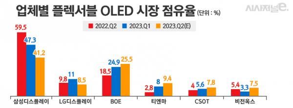 据市场研究机构Stone Partners 6月21日表示,三星显示第二季度柔性OLED出货量预计较去年同期(4650万台)减少16.3%至3890万台。其市场份额预计将从 59.5% 下降至 41.2%。三星显示在高端 OLED 市场的地位已经缩小。
