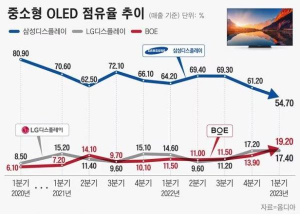 据Omdia统计,三星显示第一季度中小尺寸OLED市场份额(基于销售额)为54.7%,比去年同期(64.2%)下降9.5个百分点。与上一季度(61.2%)相比,下降超过6个百分点。