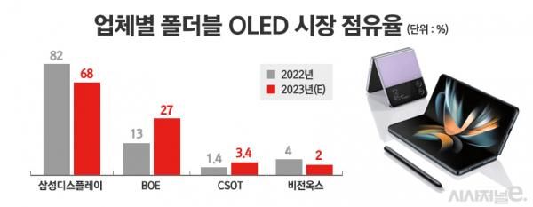 来源:DSCC三星显示的可折叠面板市场份额也很弱。据另一位市场研究机构DSCC表示,三星显示今年的可折叠 OLED 份额预计为 68%,比上年 (82%) 下降 14 个百分点。分析称,它将保持其市场主导地位,但会让中国企业迎头赶上。