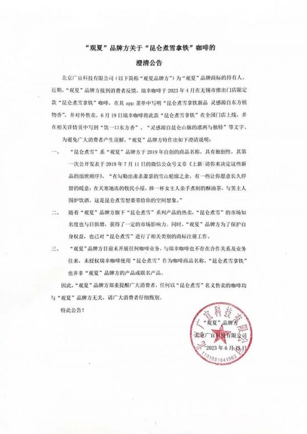 同一个“昆仑煮雪”?观夏发布澄清公告,未和瑞幸咖啡联名