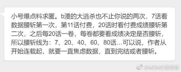 在这场充斥着火药味的讨论中,作者们或戏谑或不满地给新制度起了个外号——“七话大逃杀”。在社交平台传播最广的一条微博中,还有一条爆料称,“大逃杀”制度将如影随形,渗透进一部漫画在平台连载的全部过程。每20话一次的付费成绩考核,像一道永远无法跨越的鬼门关,摆在作者们眼前。