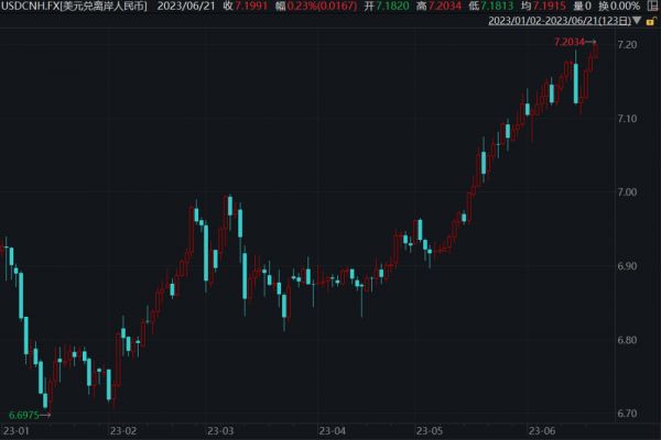 6月21日早间,更多反映国际投资者预期的离岸人民币对美元汇率盘中一度跌破7.2关口,为今年来首次。在岸人民币一度跌至7.1987。