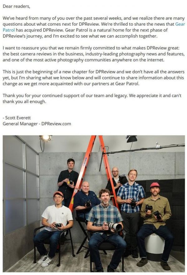 ▲ Gear Patrol 网站刊登的公告,图源 Gear Patrol 网站Gear Patrol 总经理 Scott Everett 发布公告表示:“亲爱的读者,最近几周我们听到了你们中的许多人的声音,我们意识到 DPReview 的关停将会导致很多问题。而当下,我们很高兴地分享 Gear Patrol 收购了 DPReview 的消息。Gear Patrol 是 DPReview 下一阶段旅程的家园。”