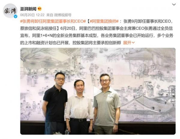 6月20日,阿里巴巴控股集团董事会主席兼CEO张勇通过全员信宣布,其将于今年9月10日卸任阿里巴巴控股集团董事会主席兼CEO职务,此后将专职担任阿里云智能集团董事长兼CEO。