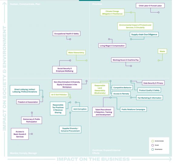图:SHEIN2022年ESG报告“实质性议题分析”图表,越靠右上角的议题越重要。