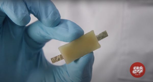 6. 最后一步,把电极封装在蜂蜡为主的可食用包装里,然后再在两级贴上食品级金箔,和糕点师傅用的是同款。