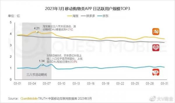 Questmobile一份关于今年3月份移动购物APP日活数据的报告显示,淘宝、拼多多和京东的日活数据中拼多多和淘宝非常接近了。