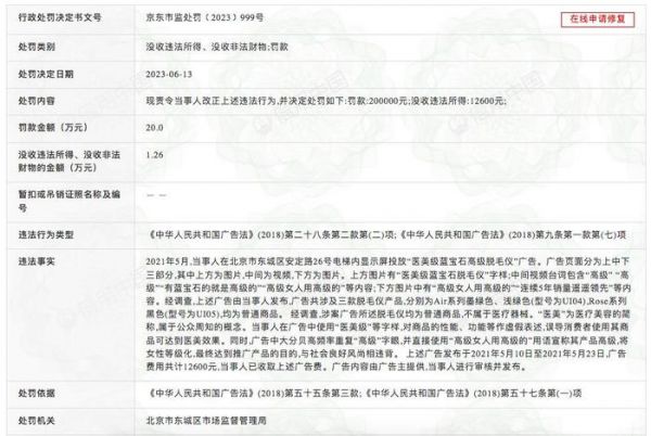 上海梯之星信息科技有限公司此次被罚的具体原因是他们在2021年5月份发布了Ulike提供的一则广告,该广告内容与“医美级蓝宝石高级脱毛仪”有关,广告页面分为上中下三部分,其中上方为图片,中间为视频,下方为图片。上方图片有“医美级蓝宝石脱毛仪”字样;中间视频台词包含 “高级”“有蓝宝石的就是高级的”“高级女人用高级的”等内容;下方图片中有“高级女人用高级的”“连续5年销量遥遥领先”等内容。
