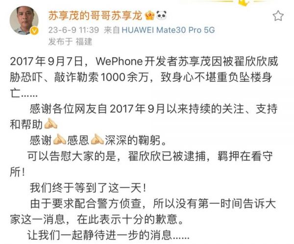 前几天,从苏享茂的哥哥的微博传来一个振奋人心的消息:翟欣欣已被逮捕,预计在未来将会得到正义的审判。