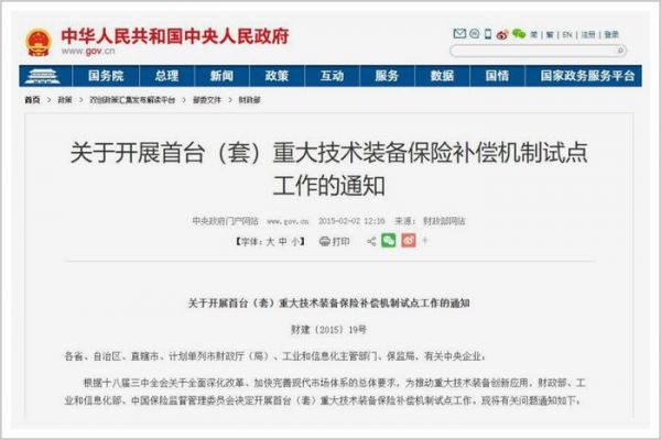 大概意思就是说如果某企业成功研发出了中国首台(套)重大技术装备,成功通过的国家的认定和验收,那么国家直属的保险公司将会出面为这台设备投保,如果有企业购买此设备导致了生产经营的损失,那么保险公司全额赔偿。