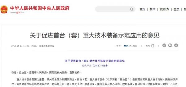 2018年,发改委、科技部等八部委又联合印发《关于促进首台(套)重大技术装备示范应用的意见》,进一步明确指出: