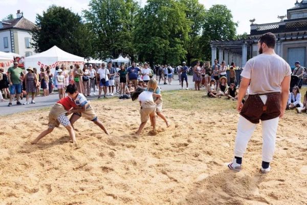 2022 年 8 月 1 日,在瑞士日内瓦,孩子们尝试瑞士传统摔跤,庆祝瑞士国庆节 新华社/欧新