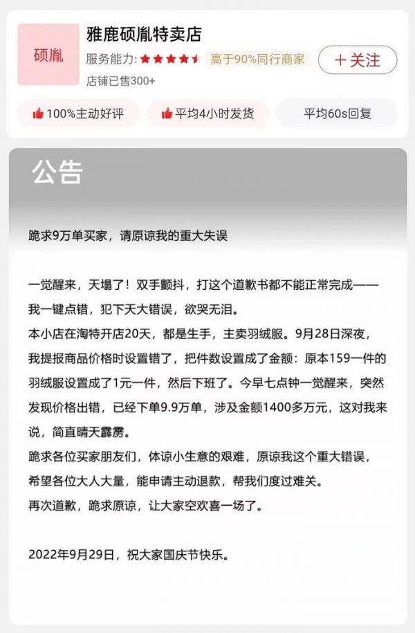 2022年10月“雅鹿硕胤特卖店”发布公告,表示新人店主错把159元/件的羽绒服设置成了1元/件。一夜之间,网友们下了9.9万单,涉及金额超1400万元!