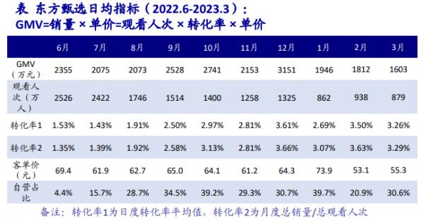 海通证券研报更具体统计了 2022 年 6 月 ~ 2023 年 3 月东方甄选的场观表现,东方甄选日均 GMV、观看人次均出现明显下滑。