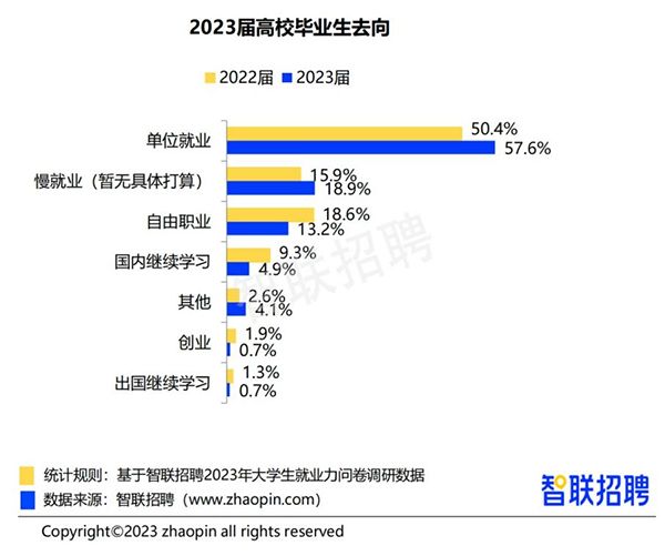 还有一个数据比去年高了很多——18.9%的学生是打算慢就业的,慢就业就是他暂时不找工作,或者不找一个签合同的工作,去做一些零工。这当中还有个数据是自由职业,2023年的比例也下降了。