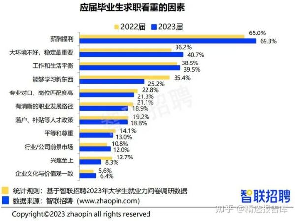 从另外一个数据也能看到当前学生的就业观念,2023届毕业生的意向去向,跟2022年对比,50%以上学生的就业意愿是单位就业,比2022年更高了。