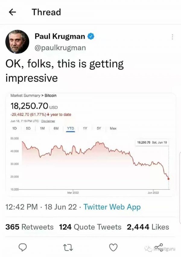 2. 2022年六月十八号,btc 价格一度下跌到 $18250, 著名经济学家,诺贝尔奖得主克鲁格曼老师又准时地在推特上跳出来,幸灾乐祸地说了一句“老乡们,这太感人了” (之前他在 2018年底比特币跌到 3000美元的时候也跳出来过一次)。克老师发言之后的一年,比特币涨了 69%。确实太感人了。