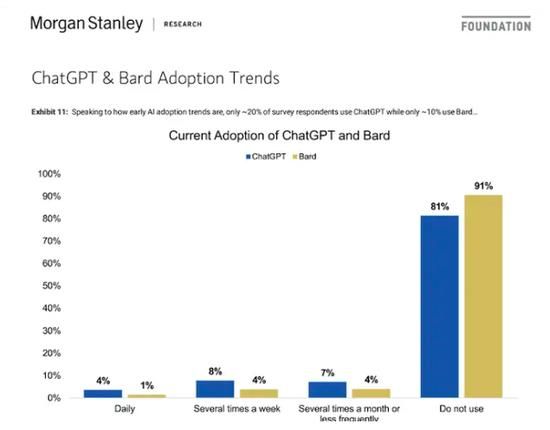 首先是关于ChatGPT的使用率,有不利的数据出现。6月初,摩根士丹利发布的一项调查显示,只有19%的受访者表示他们之前使用过ChatGPT,只有4%的人表示依赖ChatGPT。调查表示,比例低的惊人。