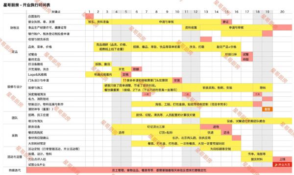 Juliet和小猫的星哥厨房,只用了20天就把店开了出来。一张详尽的开业执行表,列明了财税法、定品再到团队、运营、迭代等各个方面的具体事项。