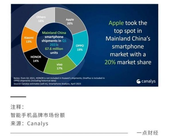 大浪淘沙后,行业的市场格局已经清晰和稳固。Canalys数据显示,今年一季度,苹果以20%的市场份额占据榜首,出货量为1330万部;OPPO(包括一加)出货量为1260万部,以19%的市场份额排名第二;vivo和荣耀的出货量分别为1130万部和970万部,分列第三和第四位;小米以850万部的出货量,占据第五位。