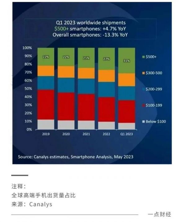 虽然智能手机整体呈下滑态势,但更多在中低端机型的上,高端市场其实并未受到太大影响。Canalys发布2023年第一季度全球高端手机(500美元及以上)出货量排名,高端手机逆势而上,同比增长4.7%,超全球智能手机总出货量的三分之一。