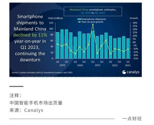 研究机构Canalys数据显示,中国智能手机市场在2023年第一季度同比下降11%,出货量降至6760万部,为2013年以来的最低水平。IDC预测,2023年中国手机销量将同比下滑0.9%。