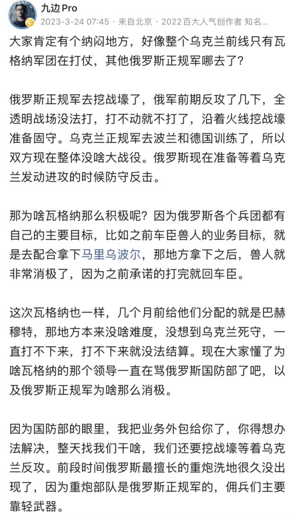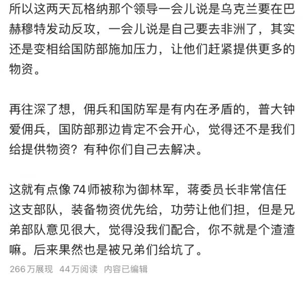 当然了,这伙人对咱们不太友好,他们对所有外国人都不友好。他们是俄罗斯内部最极端爱国的那部分。理论上讲,整个俄罗斯最不可能被收买的就是他们。如果矛盾没积累到一定程度,他们最不可能造反。那为啥造反呢?我三月份的帖子就把瓦格纳和国防部的矛盾说清楚了,那时候已经有了端倪,最近又要把瓦格纳合并进入正规军,把“厨子”(普里戈任)搞成个光杆司令,“厨子”这种人,哪能束手待毙。
