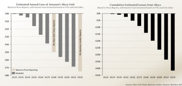 到现在,其累计销量估计超过3亿。Alexa拥有了三分之二的智能音箱市场,成功击败了谷歌智能音箱和苹果的HomePod。此外,它已被广泛部署到福特、丰田等家用车以及Sonos等扬声器系统。而在这些成就的背后,亚马逊承担了不可忽视的巨额亏损。