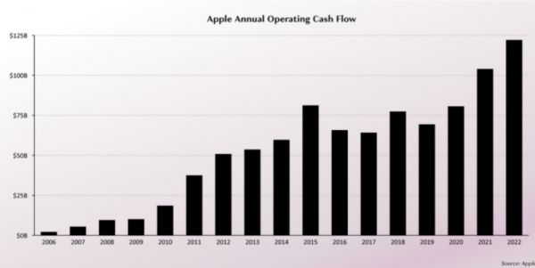 财务回报方面,iOS目前在美国占据近60%市场份额,在青少年中占据90%以上份额。在全球手机市场苹果市占率低于25%,但由于其手握最有价值的用户并能有效将之货币化,它获得了全行业超过三分之二的移动软件收入。据悉,该公司的硬件利润率超过40%综合软件利润率则超过90%。2022财年营收3943亿美元,净利润达到998亿美元,营业现金流接近1250亿美元。