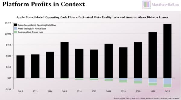 图:苹果公司的综合经营现金流与Meta Reality Labs和亚马逊Alexa部门预计的亏损对比