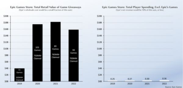 图:Epic Games商店游戏赠品的总零售价值,以及Epic Games商店(不包括EpicGames自己游戏在内的)玩家总消费