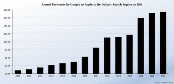 过去15年来,谷歌一直在向苹果支付巨额费用以便让自己成为iOS和Mac的默认搜索引擎。据高盛估计,这个数字已超过1200亿美元。2022年,谷歌支付的费用相当于它当年利润的三分之一(250亿:750亿)。