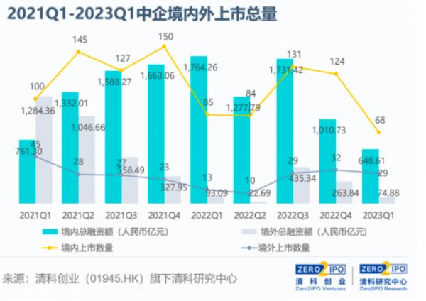 答案似乎没有想象中乐观。数据曲线最能贴切表现市场现状——根据清科创业旗下清科研究中心统计,2023年第一季度共有97家中企上市,数量与2022年第一季度(98家)基本持平。其中A股有68家,发行节奏进入调整期,同环比分别下降20.0%和45.2%。