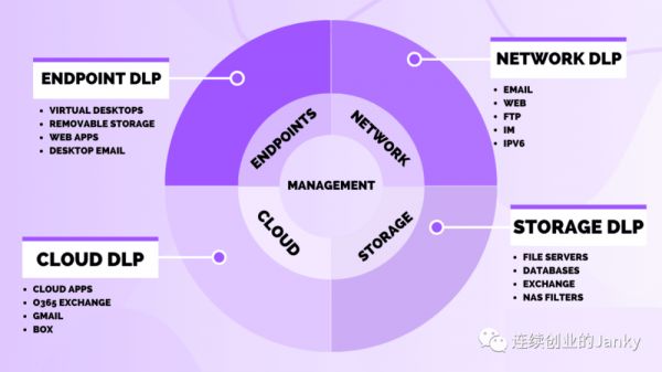 DLP 产品本身,按照数据所处位置的不同,国外同行们又定义出了 4 个分支,终端 DLP、网络 DLP、云应用 DLP、存储 DLP。很遗憾在国内的环境里,真正能被应用的只有终端 DLP 和邮件 DLP,其根本原因在于国内应用生态的落后和封闭,之前的一篇文章有详细分析过。