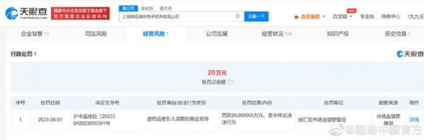 6月25日消息,天眼查App显示,近日,上海博观瑞思电子商务有限公司因虚假或者引人误解的商业宣传,被徐汇区市场监督管理局罚款20万。处罚事由显示,2022年4月1日至2023年3月31日,当事人受阿迪达斯体育(中国)有限公司委托运营抖音店铺“adidas官方旗舰店”的直播运营活动,在2022年12月直播活动中,当事人曾多次宣传消费者点亮灯牌(需要消费者花费一毛钱)、加入粉丝团后可以享受减免优惠,但实际核实确认,消费者无论是否点亮灯牌、加入粉丝团,均可获得同样优惠。